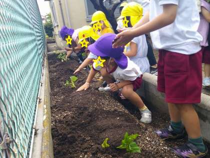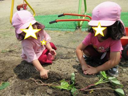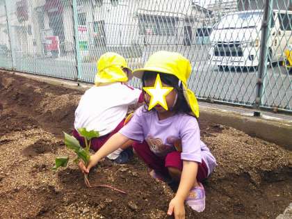 今日はみんなで幼稚園の畑にサツマイモの苗を植えました。畑に行く前に、先生と一緒にサツマイモの本や苗も見ました。先生からサツマイモの苗をもらうと、ふかふかの土のお布団にそーっと苗をいれて、土のお布団を優しくかけていました。