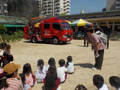 幼稚園に消防車が来たよ。