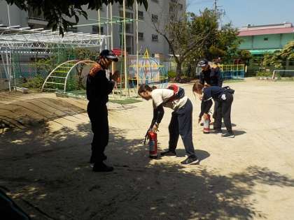 その後、先生たちは消火器の使い方を教えて頂き実践もしました。