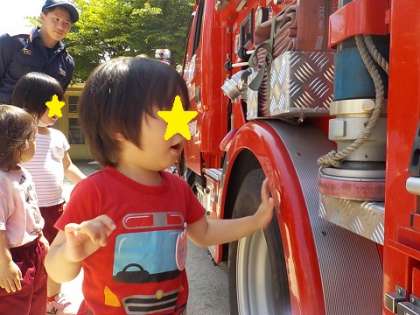最後は、消防車を近くで見せて頂きました。近くで見る消防車はとっても格好良く興味津々の子ども達でした。