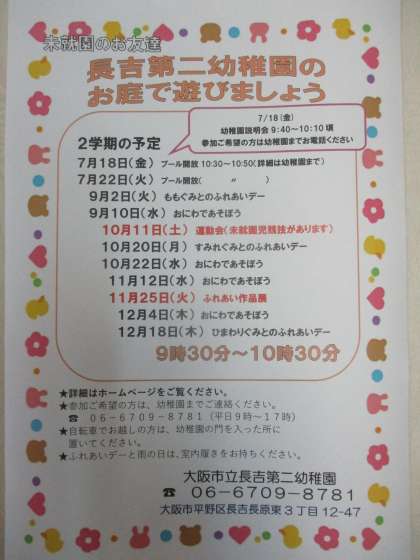 7月〜9月の園庭開放について 公開日 2025/06/19 更新日 2025/06/19 お知らせ 7月18日(金)に幼稚園説明会を行います。長吉第二幼稚園ってどんなところかな?とご興味のある未就園児の保護者様は、どうぞいらしてください。プール開放もありますよ♪ 参加ご希望の方は、幼稚園までお電話ください。 (プール開放は、雨天時や暑さ指数・雷予報などにより中止になることがあります。ご了承ください) その他、2学期には楽しい園庭開放や行事がいっぱい♪ご参加お待ちしています! いいね(0)