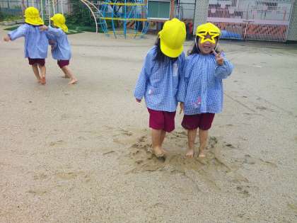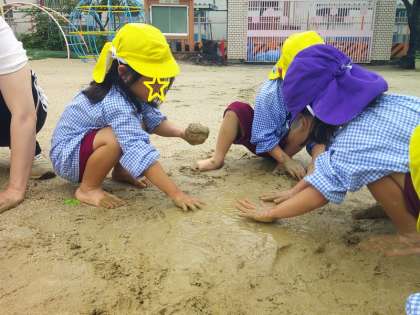 雨の止み間に園庭でどろんこ遊びをしました。ドロッとした感触に子どもたちは気持ちいい!と大喜び。