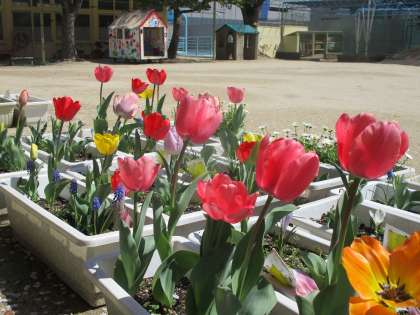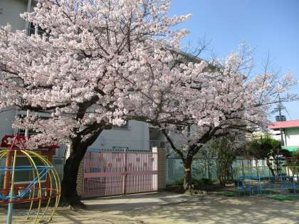 今、幼稚園の桜は満開です。子どもたちの植えたチューリップや花壇の花も咲き、園庭が色とりどりのお花でとてもきれいです。幼稚園の新年度を祝ってくれているように感じます。