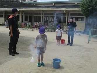 7月8日(金)に、おもちゃ花火の遊び方について、平野消防署から消防士さんが話をしに来てくださいました。花火をする場所や遊び方などを教えてもらった後、実際に花火をしながら約束を確認しました。みんな落ち着いてできていましたね。この夏は、大人の方と一緒に、約束を守って花火を楽しんでくださいね。
