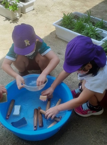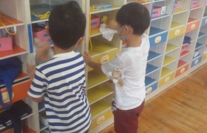 終業式の前に、1学期に使ったものをきれいにする時間をもちました。ロッカーの中を片付け、拭き掃除をしたり、水遊びの用具など、遊びに使ったものを洗ったりしました。このようにすることで、物を大切にする心が育ちます。夏休みを迎える準備もできました。