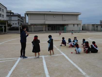 幼稚園とは違う、小学校の大きなトラックに大興奮。リレーをしたり、かけっこをしたりして、思い切り走りました。その後、遊具でもいっぱい遊び、池の鯉も見せてもらいました。