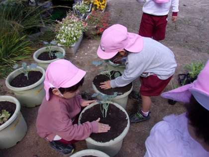 先週、ふわふわの土を作るために、みんなでふるいをかけ、土づくりを経験しました。そして、本日苗を植えました。