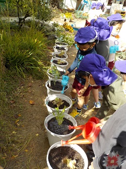 美味しい野菜になりますようにと、たっぷりお水もあげました。大きくなったら、お弁当に入れてもらおうかな、サラダにしようかな、どんな料理で食べようかなど、子どもたちはとても楽しみにしていました。