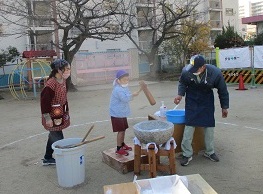12月9日(金)、園庭で餅つきをしました。みんなで「よいしょ!よいしょ!」と掛け声をかけ合いながら、一人一人が餅をつきました。杵はとても重たかったですが、それぞれに力いっぱいつきました。杵でつく度に、炊き立てご飯のようだった米が餅になっていく様子を、子どもたちは興味をもって見ていました。