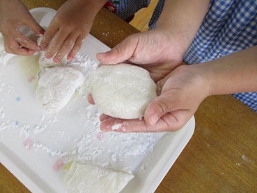 ついた餅の感触は、温かくふわふわして、とても気持ちがよかったです。子どもたちは伸びる様子に喜んだり、感触を楽しんだりして大喜びでした。最後に丸め、一人一つずつ、鏡餅を作りました。