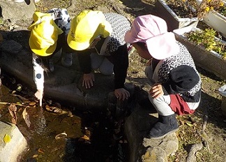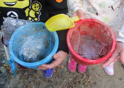 朝、園庭の池には、一面に氷が張っていて、登園してきた子どもたちはビックリ!そーっと触ってみて、氷の感触を確かめたり、強く触ると氷が動いて驚いたり・・・。割れた氷を拾い上げて大興奮!手を真っ赤にしながら、一生懸命に集めていました。今日は大きな氷をたくさん見つけることができ、その大きさに喜んだり、「ダイヤの形!」「三角おにぎりみたいな氷!」と、形の違いを楽しんだりしていました。