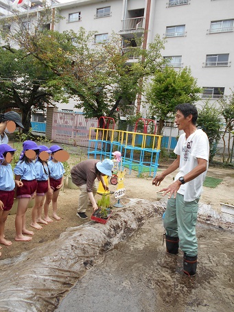 午後からは田植えです!冬に植えた種もみが育ち(3月18日付HP参照)みんなで一緒に植えました。事業担当主事さんに稲を植える時の持ち方を教えてもらい、田んぼの中でみんな並んで「せーのっ!」の掛け声に合わせて植えていきました。