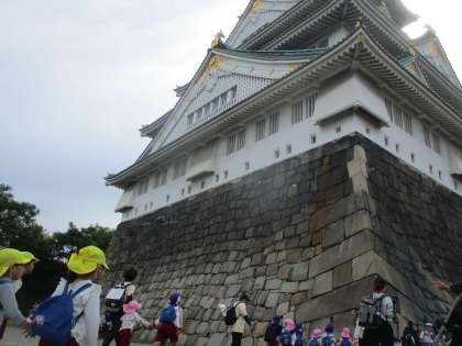 大阪城公園内を走るロードトレインに乗ってレッツゴーー!! 道行く人に手を振りながら、近づいてくるお城にワクワクドキドキしている様でした。いざ、お城の近くまで来ると大きい建物と石垣にビックリ!自分たちの体と見比べて遊んでいました。