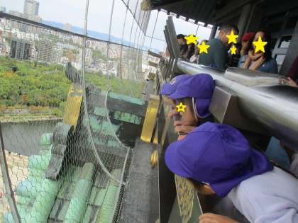 すみれ組(5歳児)は、天守閣に登り、一番上から下にいるひまわり組(4歳児)・もも組(3歳児)を見つけて「おーーい」と呼びかけ、お互いに気付いて手を振り合いました。