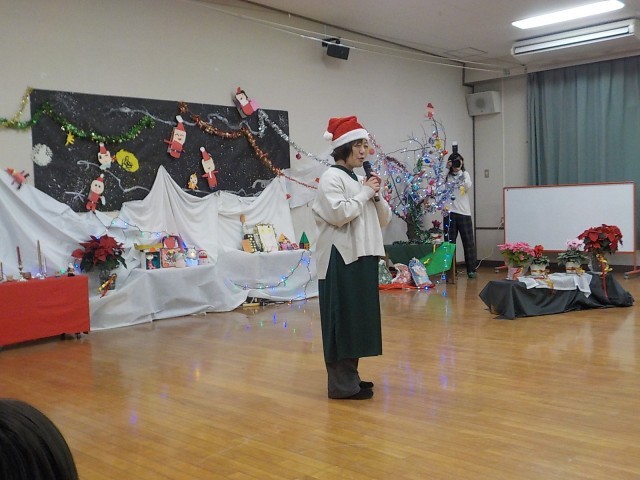 会が始まり、先生たちからの歌のお楽しみやキャンドルサービスなどを楽しんでいると、どこからか鈴の音が聞こえてきました。遊戯室の入口を見て見るとなんとサンタさんが!!