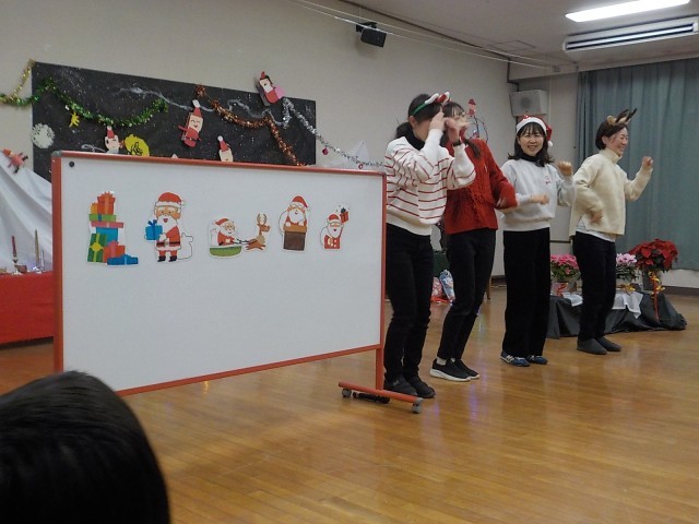 先日、サンタさんから手紙が届き今日を楽しみにしていた子ども達。朝から先生たちもクリスマスのコスチュームをつけてお出迎えしました。