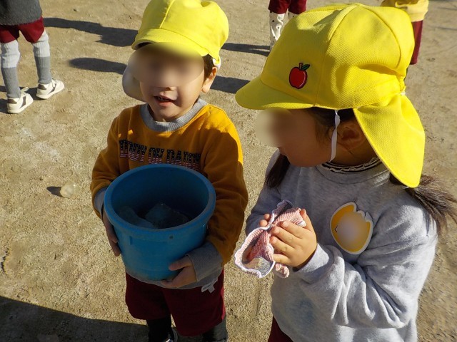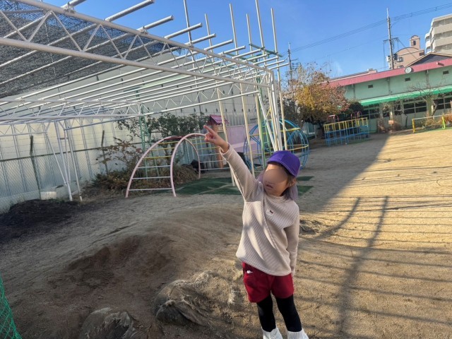 遊戯室を出て園庭を見てみると、そりが通った後に氷が落ちていました。空を見上げると一筋の雲があり、子ども達は指をさし「サンタさんが通って帰った道がある」と言いながらずっと空を眺めていました。