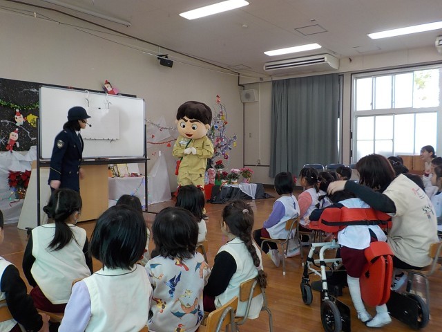 終業式のあとは、平野警察署と大阪府警察本部の方による防犯教室を行いました。「ゆうかいするぞう」さんと警察官の方の会話から、誘拐されないために大切なことを教えてもらいました。