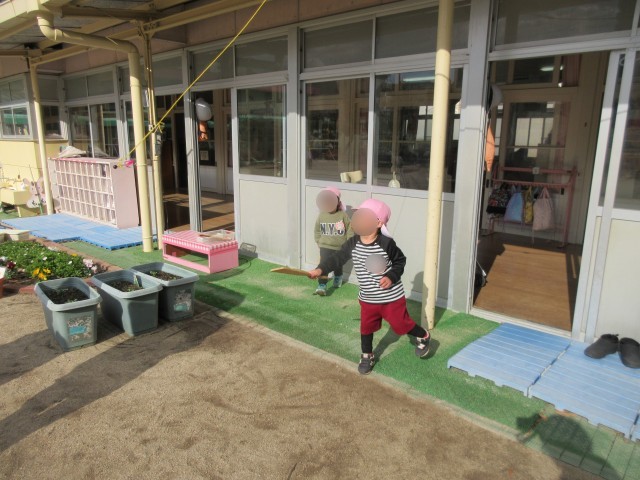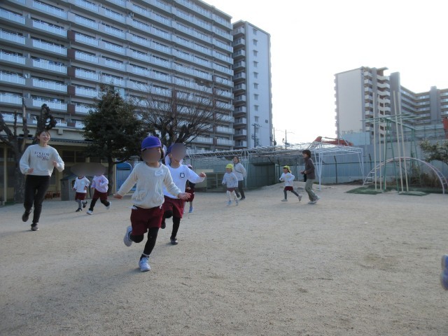 「寒い、寒い」と言っていた子ども達も、体操とマラソンをすると体がポカポカしてきたようで「暖かくなってきた!」とよりパワフルになって遊び始めました。