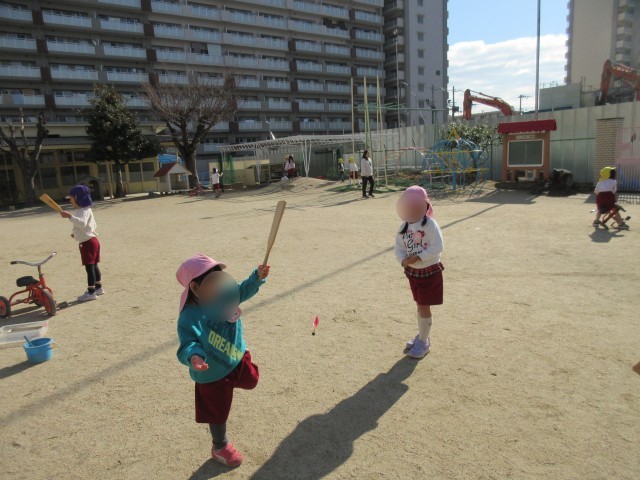 それを見ていた子ども達も「やりたい」と挑戦していました。羽をつき合うのはなかなか難しいですが、友だちや先生と顔を見合わせて遊ぶと自然と笑顔がこぼれていました。