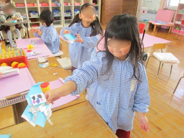 「先生、見て見てー!」「じゃーん!」とつくったものを見せに来てくれた4歳児ひまわり組の子どもたち。今クラスで歌っている“雪のペンキ屋さん”を折り紙と切り紙で作ったそうです。