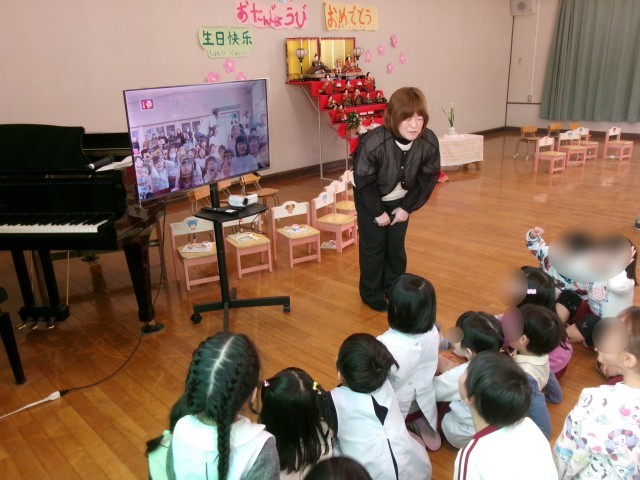 園長先生からはピアノで1年間の歌メドレーのプレゼント!ビデオでピアノの中や手元を映して普段なかなか見る事が出来ない場所を見せてもらいました。