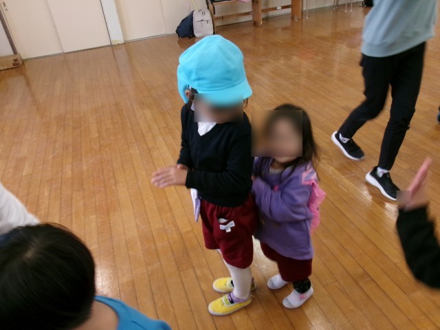 いっぱい外で遊んだ後は遊戯室で歌を披露しあいました。見てもらう嬉しさを感じ、堂々と歌っていました。ご飯も一緒に食べて、あっという間に時間がたっていました。お別れするのは寂しいけれどいっぱい遊んで楽しい気持ちがいっぱいの子どもたちでした。