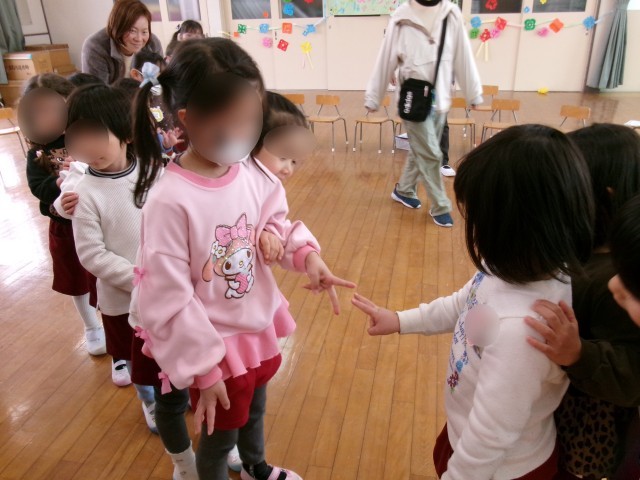 会の中では、じゃんけん列車やダンス、カメラクイズで盛り上がり、異年齢との関りがより深まった1日となりました。 最後にはひまわり組ともも組から写真とフレームのプレゼントを渡し、またすみれ組からも手作り玩具のプレゼントが。