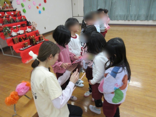 すみれ組(5歳児)の為に遊戯室の飾りつけやプレゼントをつくりなどの準備をしてきたひまわり組(4歳児)ともも組(3歳児)。この日を楽しみにしつつも、ちょっぴり寂しい気持ちで会に参加している様子でした。