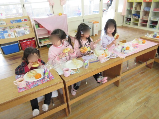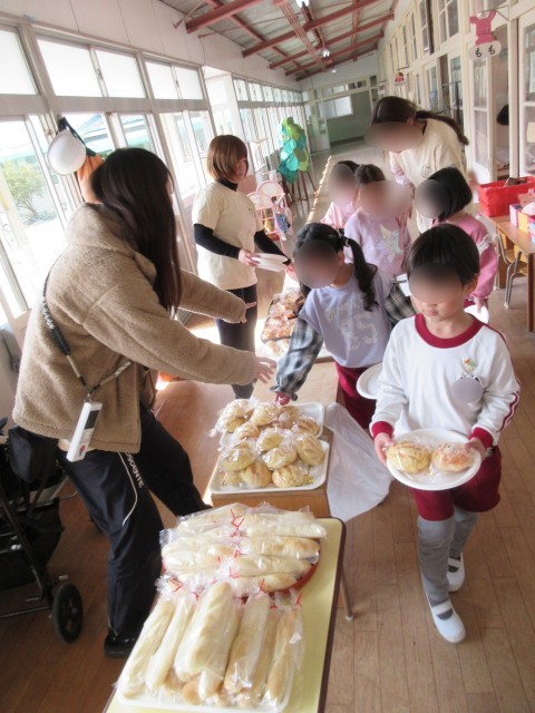 みんなで遊んだ後は、お昼ご飯のパンバイキング!自分で食べたいパンを選んでみんなで顔を見合わせて「美味しいね」とニコニコと顔を見合わせて食べていました。食後も引き続いてみんなで遊びました。 もらったプレゼントでも早速遊んでいましたよ。