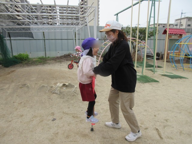 やったことがない子どもがほとんどで、初めは先生の支えがないとできなかった子ども達でしたが遊んでいくうちにピョンピョンと軽やかに跳ぶ姿に、、、跳べるようになると益々楽しくなってきたのか友だちと交代しながらどんどん挑戦していました。