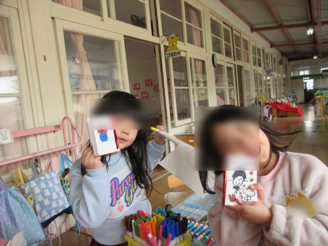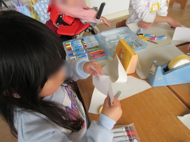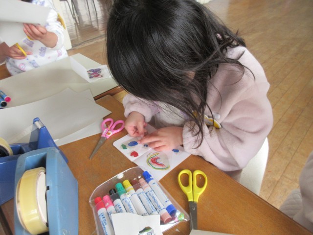 自分で描いた絵の周りをハサミで切って、後ろに輪っかにしたテープを貼り自分だけのシールづくりをしていました!そしてそれを小さい手作りノートに貼って自分だけのシール帳をつくって遊んでいました。