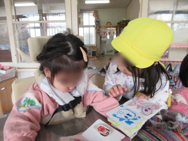 できがあったシール帳を友達と見合いっこして「それ可愛い!」「交換しよう」「私もハートのシールつくろう!」と友だちとの会話を楽しむ姿も。