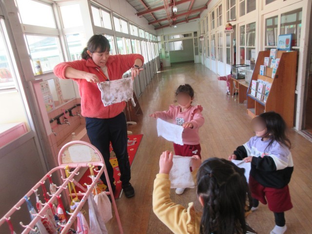 すみれ組(5歳児)が立派に修了し、登園後は少し寂しそうなひまわり組(4歳児)ともも組(3歳児)でしたが、明日は4月から新しいもも組になるお友達が遊びに来ることを知ると大喜び。「早く会いたいな」「一緒に遊びたい!」と、楽しみにしています。もも組の部屋で一緒に遊ぶので、もも組さんはみんなで部屋をお掃除!まだまだ力があるので廊下までピカピカにしてくれましたよ。