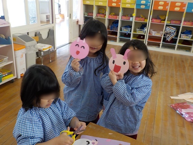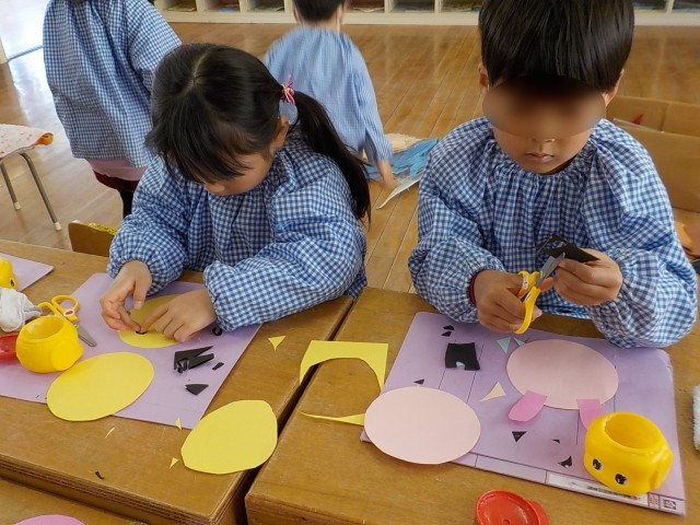 そして、ひまわり組さんは何やらかわいい動物さんをつくっていました。集中してつくっている姿、友達と見せ合いっこしてにっこり楽しそうな姿、どれも一つ一つに気持ちがこもっていますね。このかわいい動物さんは新しいもも組さんへのプレゼントで、何かに変身するようです…。4月の入園式にもらえるそうなので楽しみにしていてくださいね♪