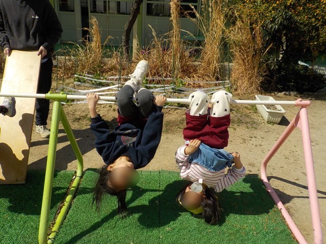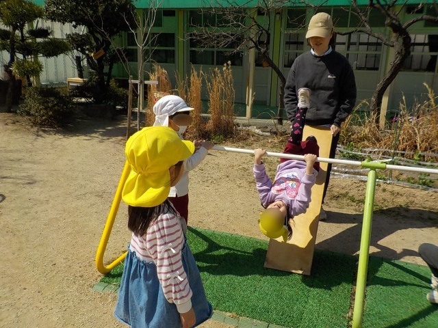 先生と一緒に、鉄棒で逆上がりに挑戦したり友達と一緒にぶら下がったり、いいお天気の中いっぱい遊びました。