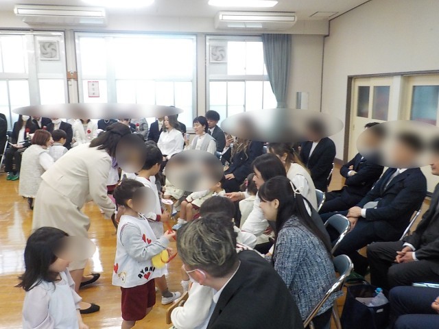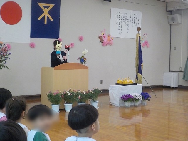 式が始まり、園長先生とミミちゃん(うさぎのぬいぐるみ)からのお話や入園するお友だちを待っていた在園児からはお祝いの言葉と歌のプレゼント、すみれ組(5歳児)がつくった動物のペンダントを贈りました。早速ペンダントを首にかけてもらって嬉しそうな新入のお友だちでした。
