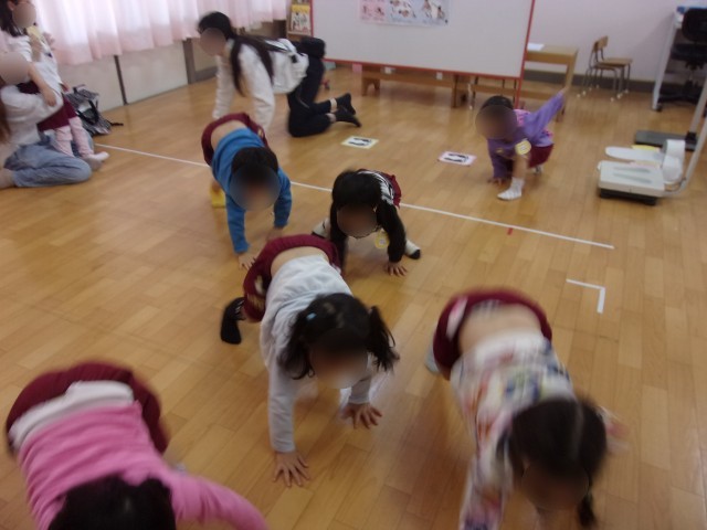 4歳児ひまわり組と5歳児すみれ組では、和式トイレの使い方について保健指導を行いました。洋式トイレが少ないため和式トイレが使えるようになると、トイレを待たなくてよくなることを伝えました。その後、実際に和式トイレの模型にまたがり、使い方を確認しました。足を鍛えることで簡単にしゃがむことができることを伝え、足を鍛えるストレッチを行いました。クマやラッコ、カエルなどいろいろな動物になるストレッチをすると、「これおうちでよくやるよ!」と周りの友達に話す姿も見られ、楽しみながら取り組む様子が印象的でした。今後も和式トイレへの抵抗感が少しずつ和らぐように声掛けを行っていきます。