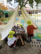 4歳児ひまわり組さん、忙しそうに火を起こしたり材料を集めたりしてテントの下でバー...
