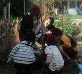 3歳児もも組と4歳児ひまわり組が、裏庭の畑でジャガイモの種イモを植えました。「こ...
