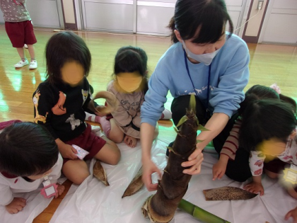 お休みの日に、タケノコ堀りに出かけた先生が、幼稚園にタケノコを持ってきてくれま...