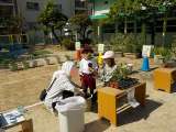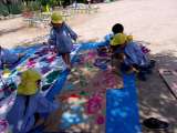 園庭に大きな紙を広げ、絵の具で遊びました。 「かわいい絵を描くねん!」と好き...