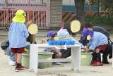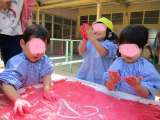 園庭の木陰で、指絵の具で遊ぶ姿がありました。「ホイップを入れますよー」と先生がプ...
