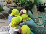 バケツいっぱいに集めたダンゴムシを、頭を寄せ合ってみんなで見ているひまわり組さん...
