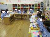 5歳児すみれ組は、ハサミやのり、パスなどを使ってアジサイの製作をしました。折り紙...