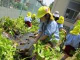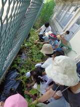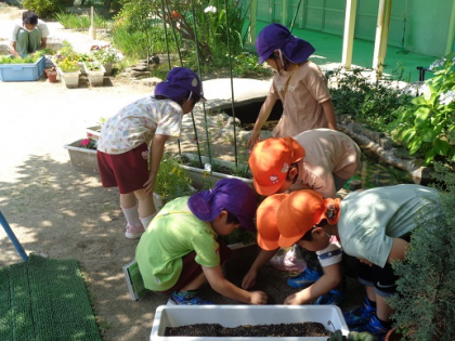 幼稚園の畑に、サツマイモの苗を植えました。サツマイモの苗は、他の野菜の苗とは違...