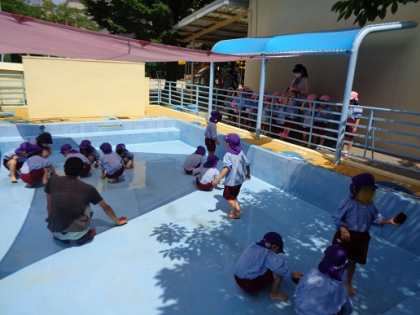 明日はいよいよプール開きです。今日は、明日のために、5歳児がプール掃除をしまし...