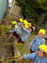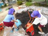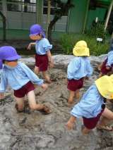梅雨の晴れ間に、もも組(3歳児)が泥遊びをしました。 スコップやバケツを使い...