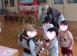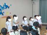 朝からおうちの方と笹の飾りつけをし、今日は七夕遊びです。集会では、5歳児すみれ組...
