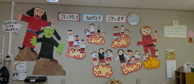 あお組さんと過ごせるのもあと1ヶ月。あか組ともも組で、あお組さんのお別れ会をしました。楽しかった思い出を話しあったり、一緒にもうじゅう狩りやだるまさんがころんだのゲームをして楽しみました。感謝の気持ちを込めて作ったプレゼントも渡し合いました。